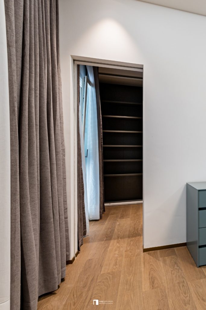 Porte coulissante affleurante à galandage 210H, en finition blanche, choix pour fermer l’accès au dressing, avec poignée niche encastrée sans cliquet (condamnation). Idéal pour optimiser l’espace tout en conservant des lignes épurées.