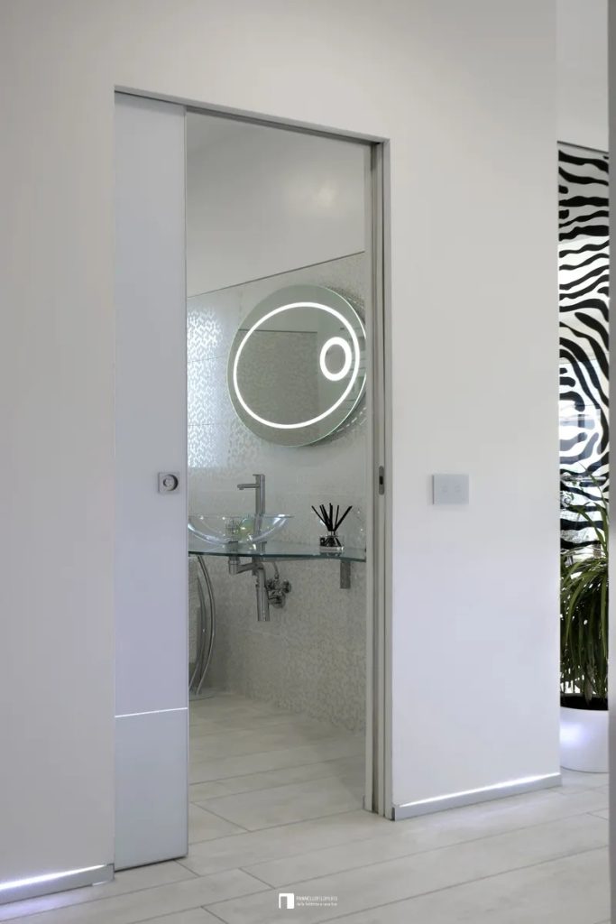 Porte coulissante affleurante standard avec finition blanche, qui s’intègre au mur et met en valeur le style moderne de la salle de bain. La poignée à niche encastrée sans condamnation garantit praticité et continuité esthétique, idéale pour les salles de bains et les zones de service.