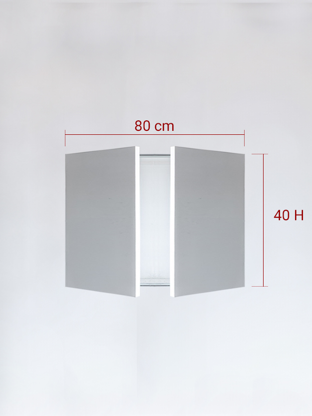 Différents types de panneaux invisibles: Panneau invisible 1 vantail pour niche 20×180 avec sens d'ouverture de la porte vers la gauche avec système de fermeture Pression (sans poignée); Panneau invisible 1 vantail verse le Haut 120×50 avec système de fermeture Pression (sans poignée); Panneaux invisible 2 vantaux pour niche 90×150 avec système de fermeture Pression (sans poignée); Panneau invisible avec vantaux plies et avec a système de fermeture Bouton extractible en argent satiné.