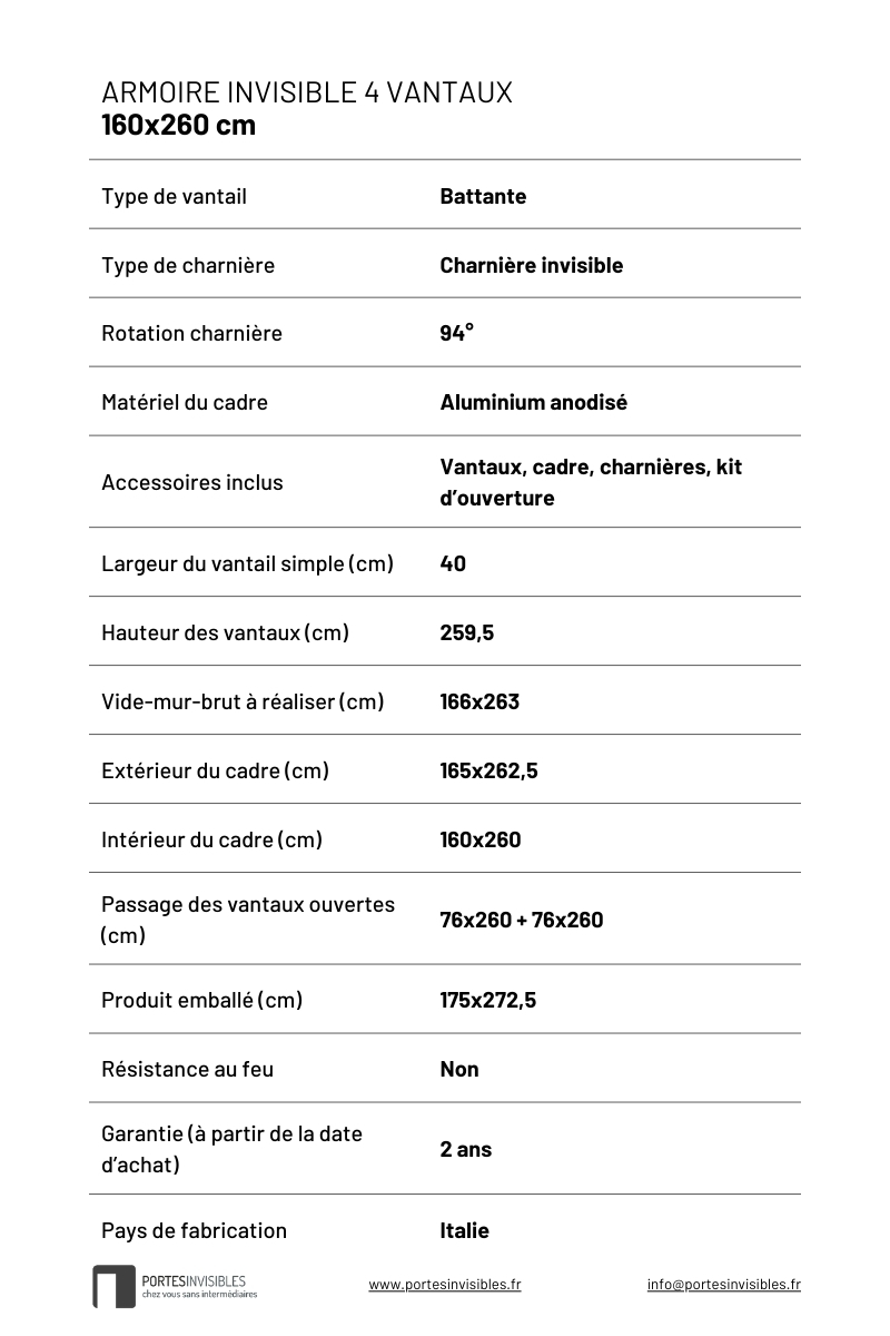 ⚠️ Les systèmes d’équipement intérieur (étagères, tablettes, commodes, porte-manteaux, etc.) ne sont pas inclus dans nos produits.